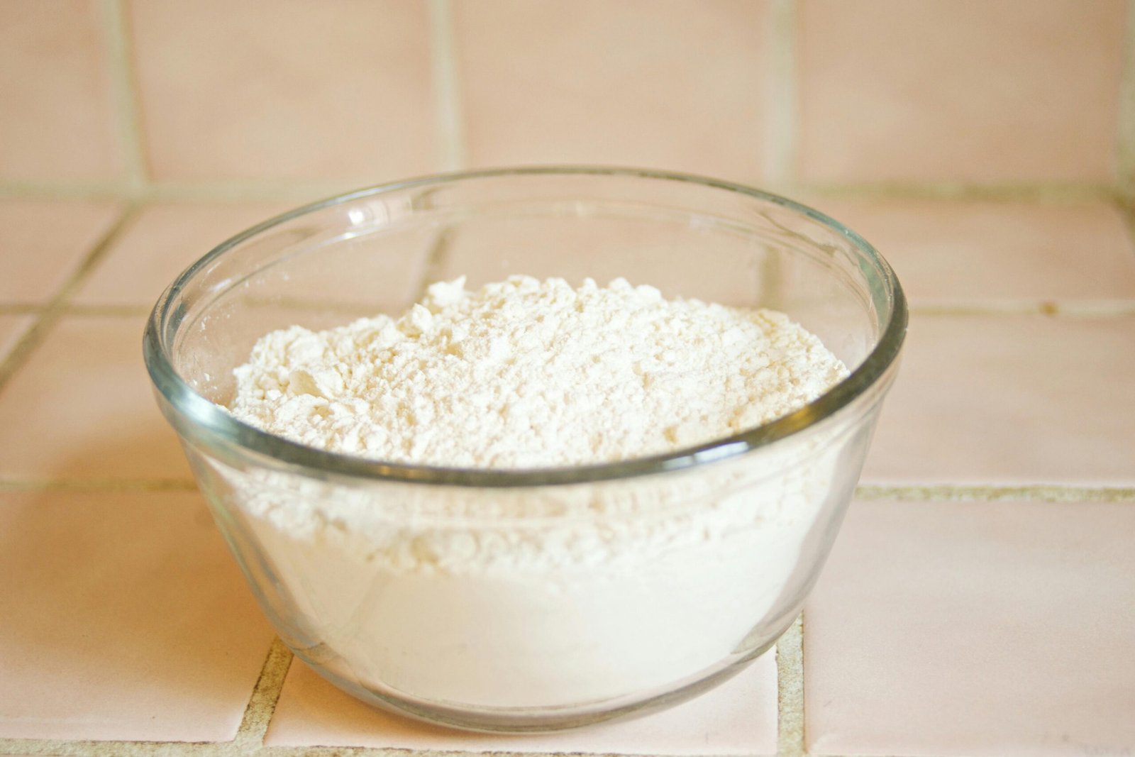 Close-up of a glass bowl filled with white flour, a common baking ingredient.Baking Powder